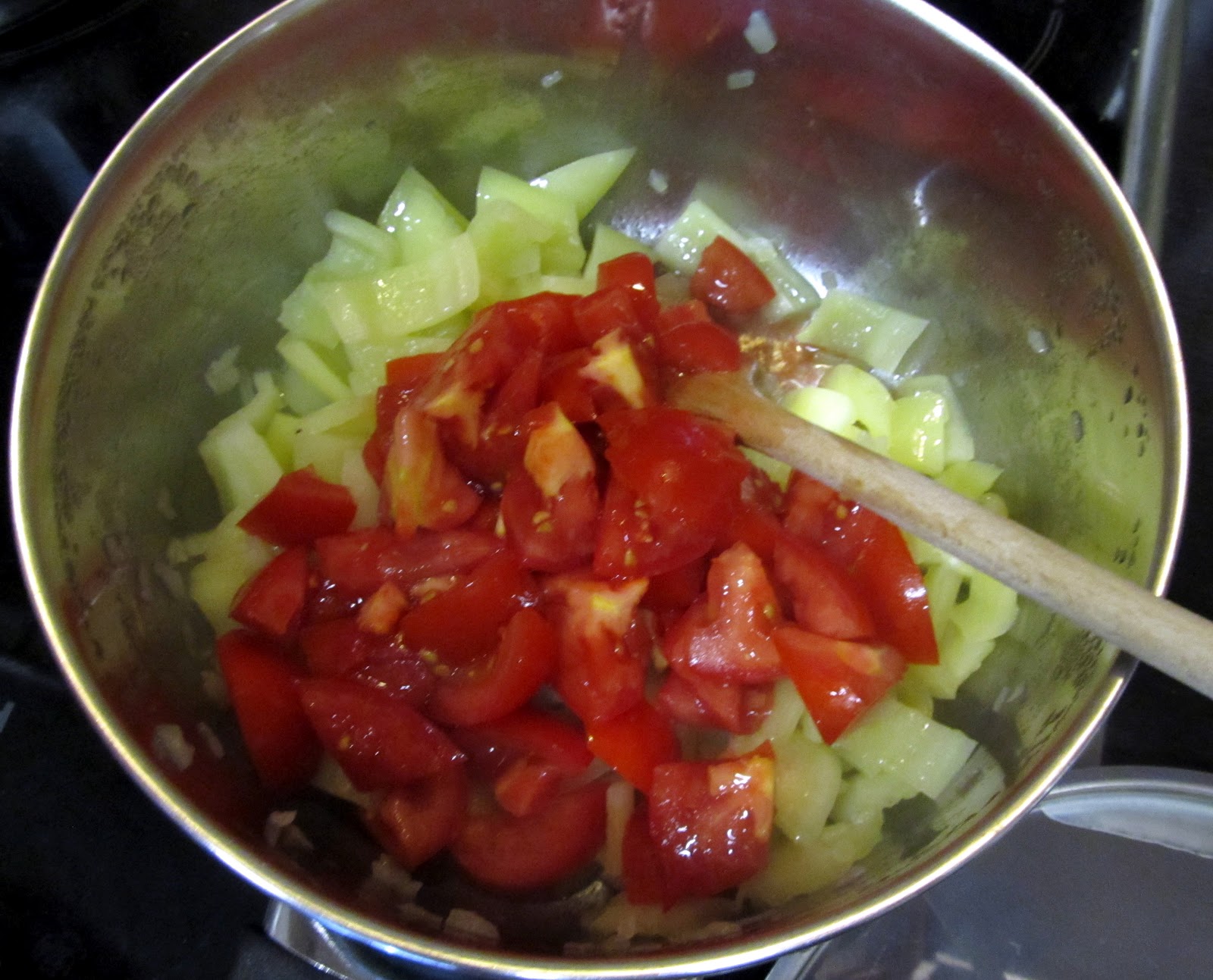 A paprikát kb. 5 percig pároljuk a fedő alatt, majd kóstoljuk meg. Ha a kóstoláskor már nem frissen ropogós, de még nem is teljesen puha, akkor jöhet a paradicsom. A paradicsommal együtt adjunk hozzá pár karika kolbászt is (én ötöt tettem bele), és főzzük tovább kis lángon fedő alatt.
